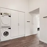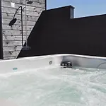 5 Star Holiday Home In Bogense beschikt over een badkamer met een bubbelbad en een wasmachine.